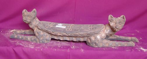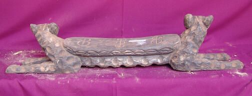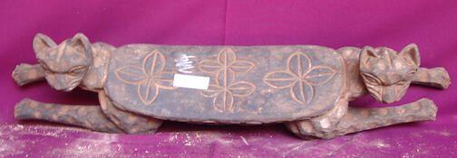 Zoomorphic sculpture including two leopards that are lying down, their heads turned towards the left and right. Top of the footrest and edge are carved with cowrie shapes. Remnants of black and white pigment.