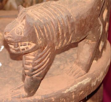 Circular seat with a high curved back carved from a solid piece of wood, rounded and carved out diamond shapes throughout. Back extends to arms in the form of lions, heads faced out, with open mouths showing teeth, appearing as though tails curve up to form the edge of the back. Seat is held up by a crouching male figure (perhaps the Fon) in traditional cap, and loin cloth, arms akimbo and behind him resembles the back of the throne itself. On either side stand two figures holding calabashes in both hands, similarly dressed. At the back is an antelope head, horns touch the seat, nose touching the base. Base is an open circle.