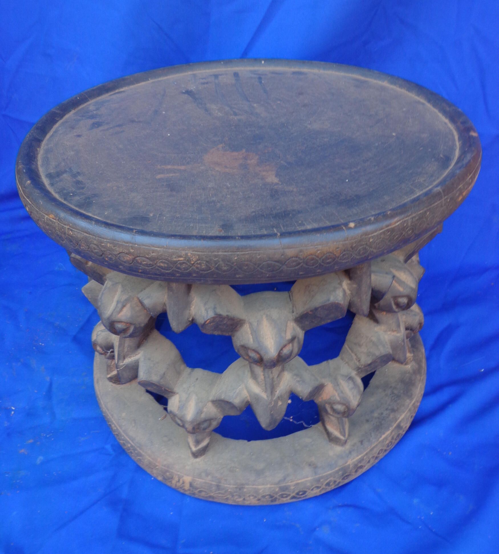 Throne Furniture Description Round stool set upon zigzag carvings of 14 bat's heads all around. Edge of the seat and base are carved with connected cowrie shell images and lines and dots. PDF Viewer Close × Profile Viewer Close × Entry/Object ID2014.01.064ContextSeat for the FonDimensionsHeight16 cmWidth23 cmDimension NotesH: 16 cm W: 23 cmMaterialsMaterialWood