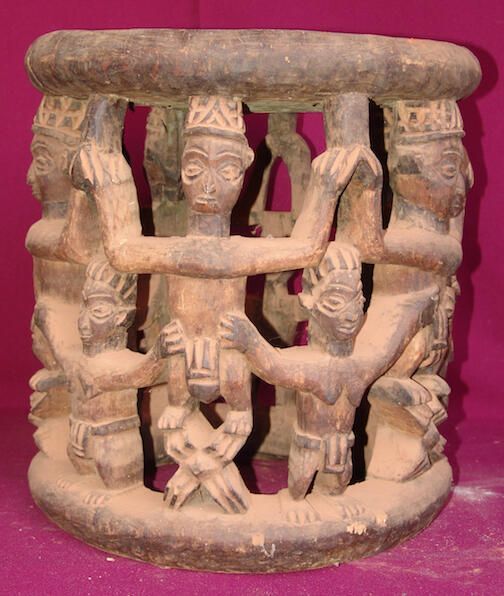 Throne Furniture Description Round seat supported by figures of ten men with upraised arms, wearing traditional caps and loin cloths. Some are standing on figures of spiders. PDF Viewer Close × Profile Viewer Close × Entry/Object ID2014.01.297ContextSeat for the FonDimensionsHeight47 cmWidth44 cmDimension NotesH: 47 cm W: 44 cmMaterialsMaterialWood
