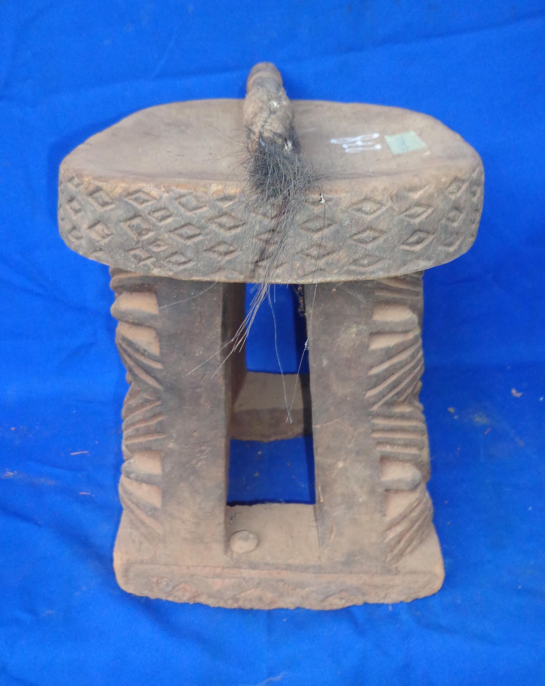 Round seat supported by two spiders stacked in each of the four corners of the pillar beneath it. Seat is decorated with carved cowrie shell shapes around the edge. The whisk accompanies the throne. The handle is covered in leather, the end of which is carved in geometric shapes. Whisk of black hair, unknown origin