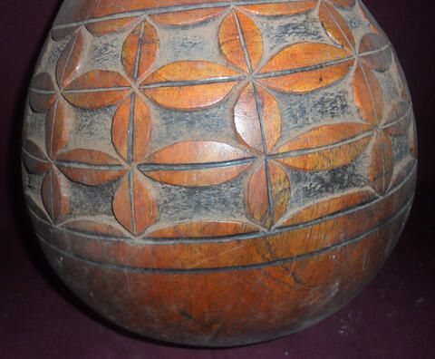 Wooden vessel in the form of a calabash with a long straight neck. Carved and painted with cowie shell shapes arranged in a floral pattern. Capped with a wooden lid decorated with 16 cowrie shells.