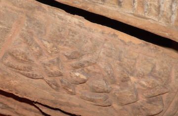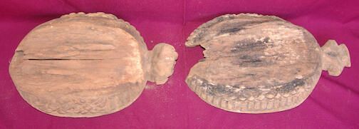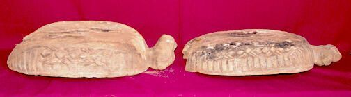 A. Bowl in the shape of a turtle with a tail at one end and what might have been a leopard head at the other. Sides carved with two spiders on each, totaling four, and textured like reptile skin. B. Bowl in shape of turtle with tail missing, what looks like a human head at the other end. Sides carved with four spiders on each side, textured with vertical lines.