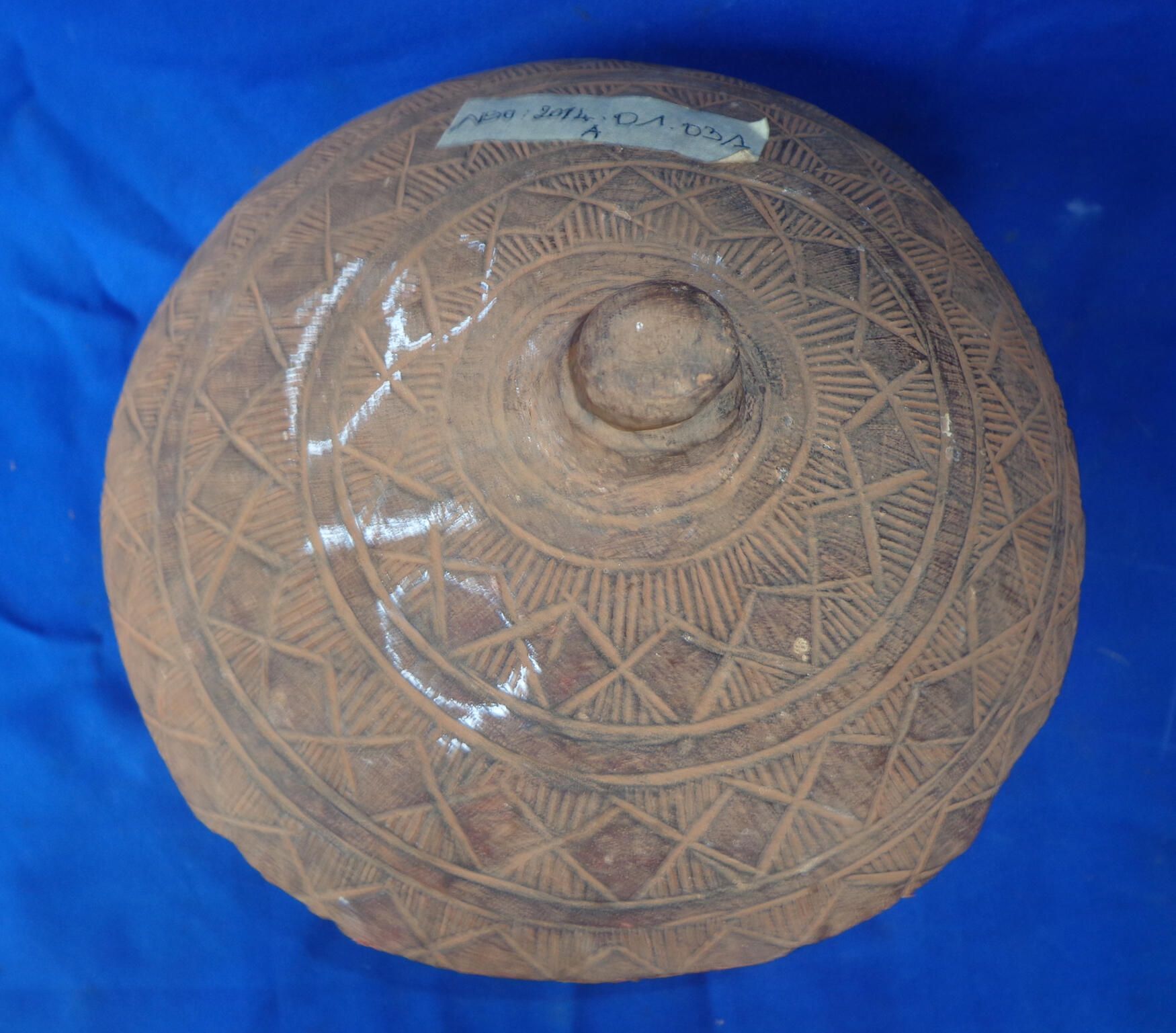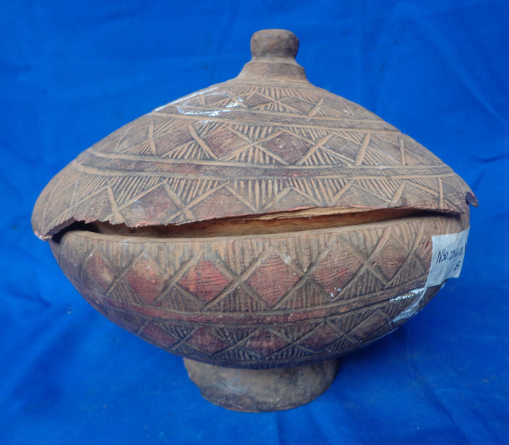 Bowl and cover are carved with diamond and line patterns typical of Fulani designs. Diamond shapes are colored with red pigment. Cover is dome shaped coming to a knob handle at the top. Dish tapers to a round raised foot.
