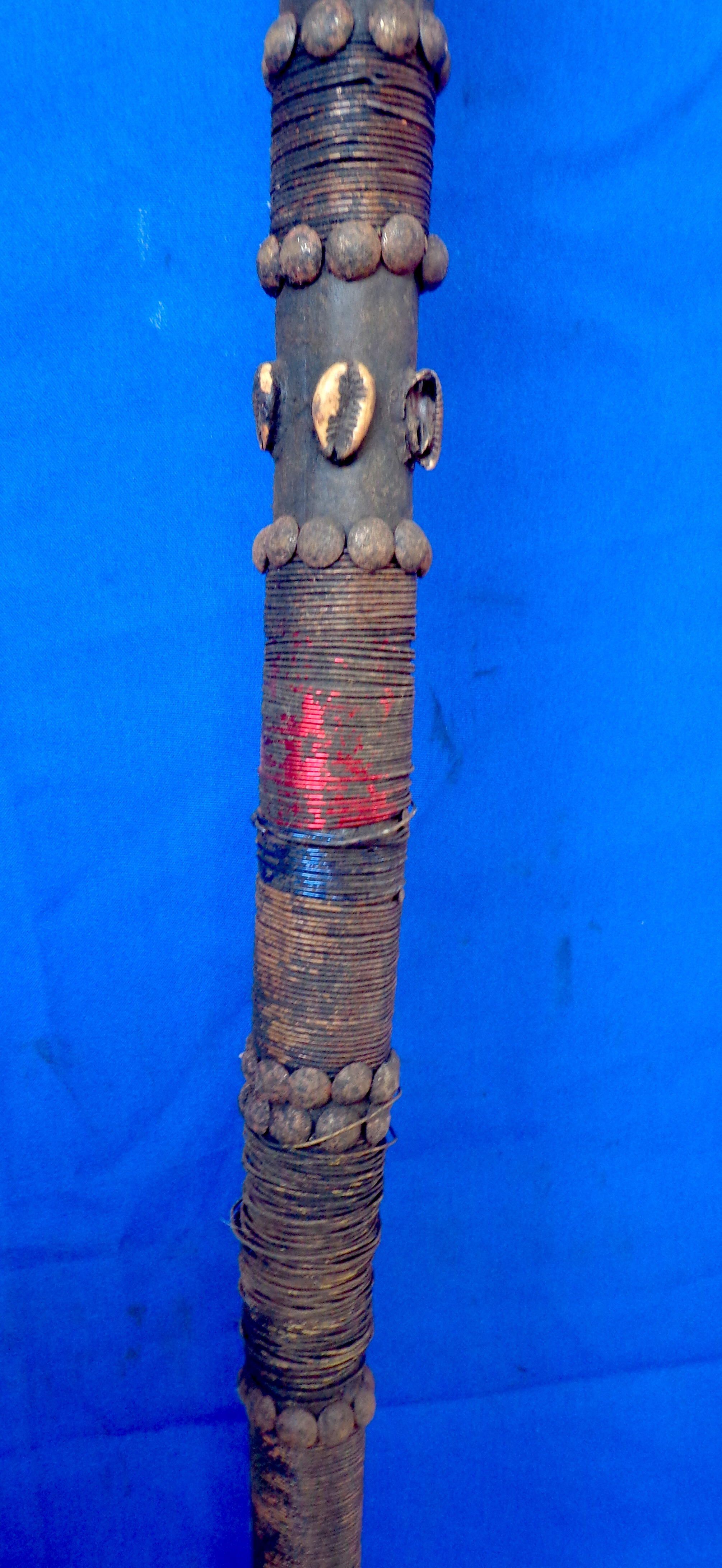 Staff Object/Artifact Description Long staff with knob handle. Decorated with cowrie shells, brass tacks, wire, and pigment PDF Viewer Close × Profile Viewer Close × Entry/Object ID2014.01.008DimensionsHeight132 cmWidth7 cmDimension NotesH: 132 cm W: 7 cmMaterialsMaterialWoodMetalcowrie shellspigment