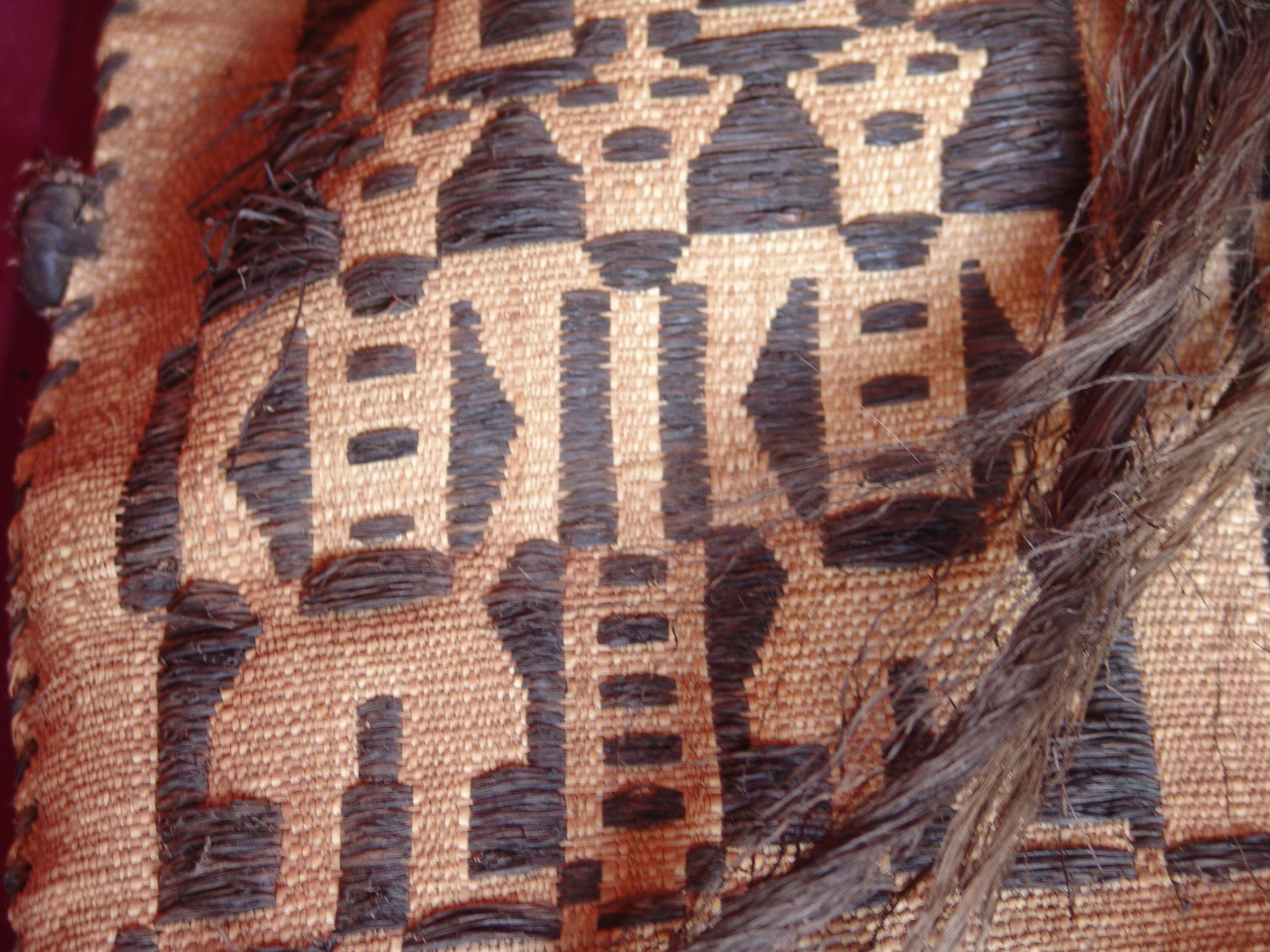 Flat bag woven with light and dark fiber to form a pattern of twelve male figures on the front side of the bag. Corners are fringed with darker colored fiber, as is the braided, looped handle.