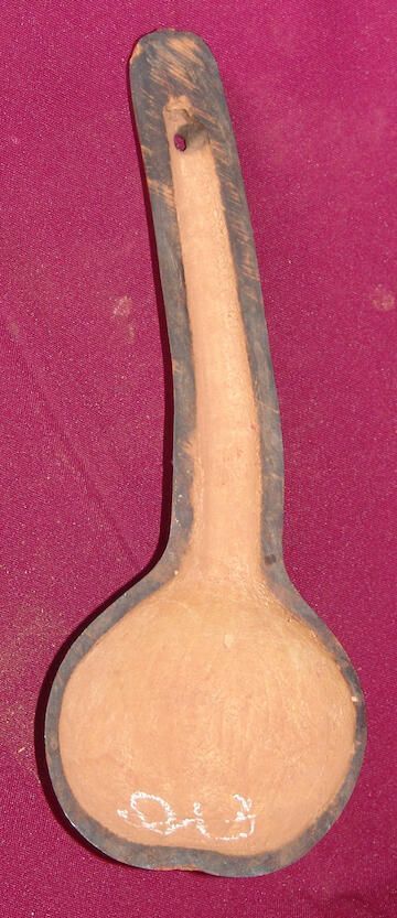 Spoon Object/Artifact Description Spoon made from a halved long-necked calabash. Back decorated with geometric and plant forms by carving and burning. PDF Viewer Close × Profile Viewer Close × Entry/Object ID2014.01.213ContextUsed for serving foodDimensionsHeight25 cmWidth5 cmDimension NotesL: 25 cm Diameter: 5 cmMaterialsMaterialCalabash