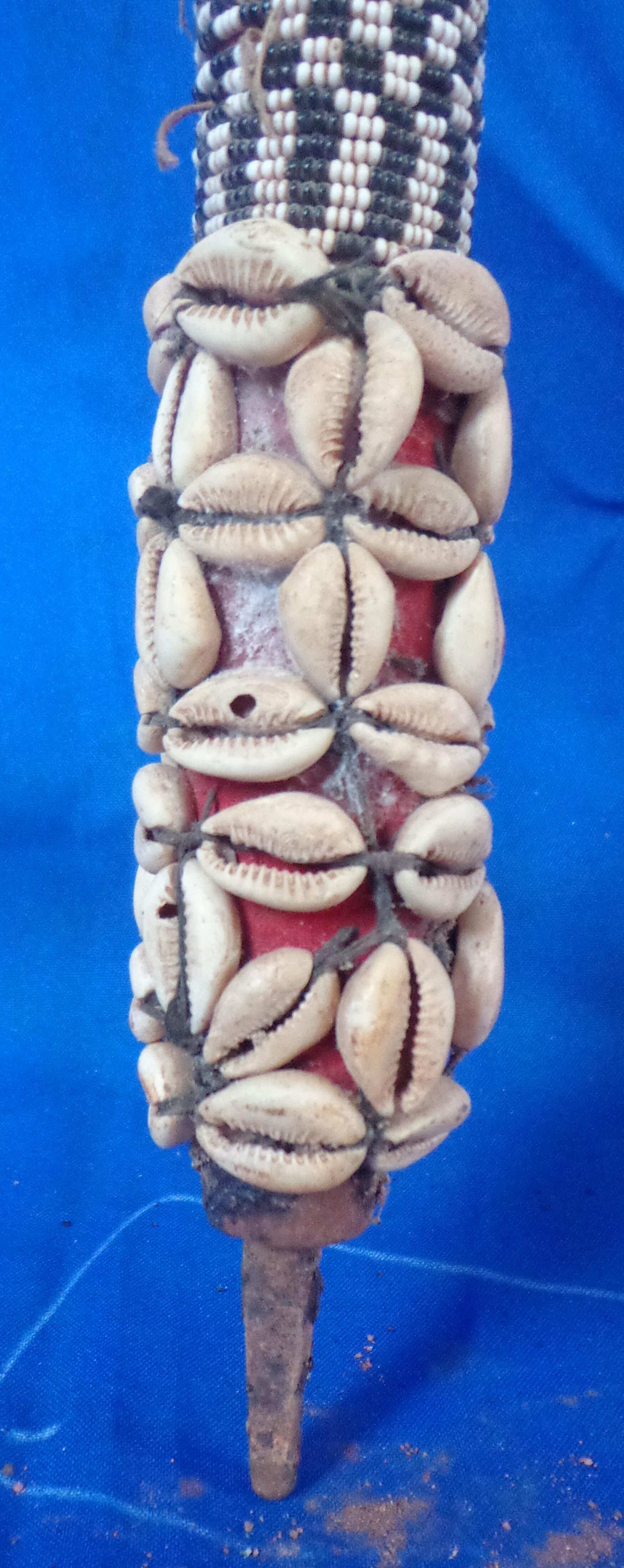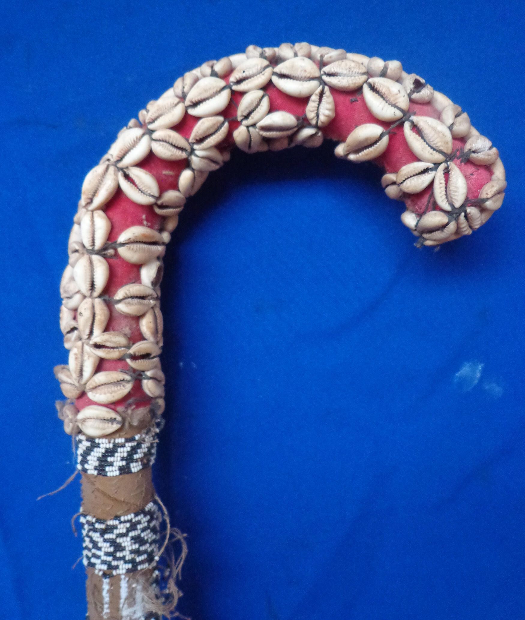 Cane-shaped staff of wood covered with red cloth and decorated with cowrie shells on the handle and in two bands around the shaft and near the tip, with small black and white beads filling in the gaps. metal tip.